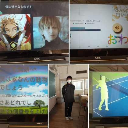 先週の1年生の技術の授業の様子です。一人一台の学習者用端末(クロムブック)を使って、スライド作りをしています。スライドをつくったり、パワーポイントを活用することは将来役に立ちますね。スライドのアニメーションや画面切替はもちろん音声や動画を挿入し、独自のアレンジを加えたものが3週間の授業で完成しました。どの作品もアイデアや工夫が感じられました。
