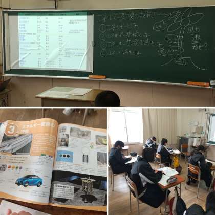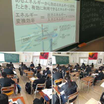 2年生技術の授業では、エネルギー変換の技術について学習しています。今日は身の回りのエネルギーについての内容でしたが、来週以降は日本の主要な発電所や発電方法について学びます。また、そこでつくられた電気がどのように家庭に送られるかも含めて勉強します。