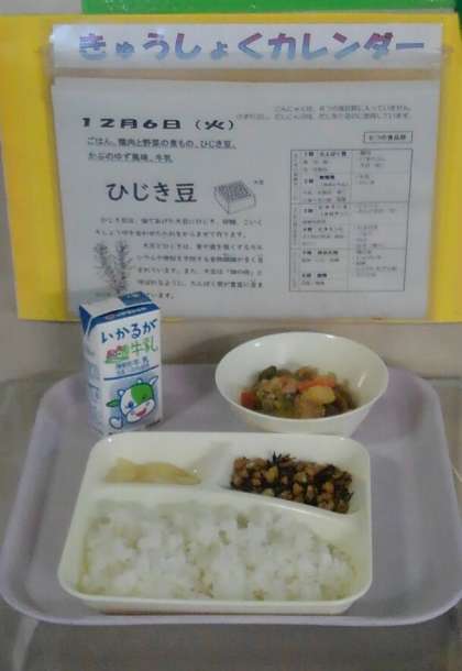 鶏肉と野菜の煮もの ひじき豆 かぶのゆず風味 ごはん 牛乳