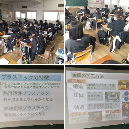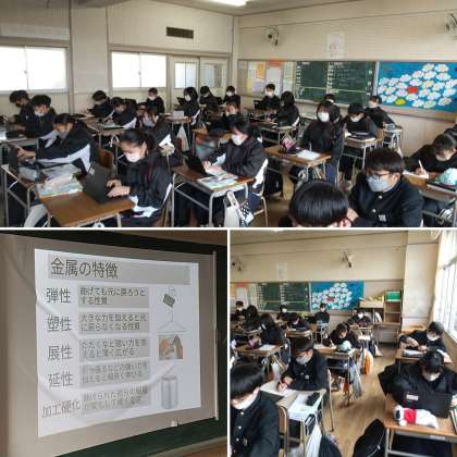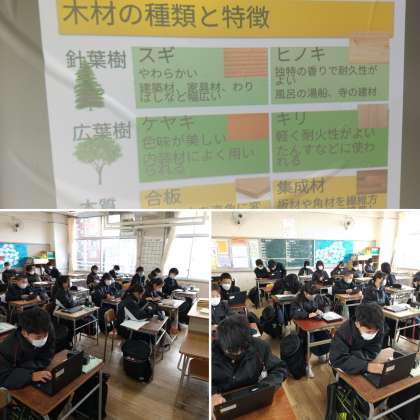 今日の技術の授業では、木材・金属・プラスチックの特徴について学習しました。身の回りにある木材は用途によって材料が違うんですね。来週は木材の種類や木質材料についても学習します。