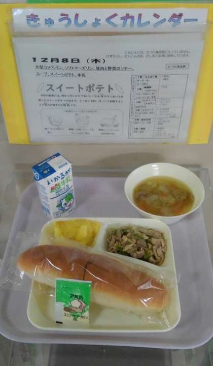 豚肉と野菜のソテー スープ スイートポテト 大型コッペパン