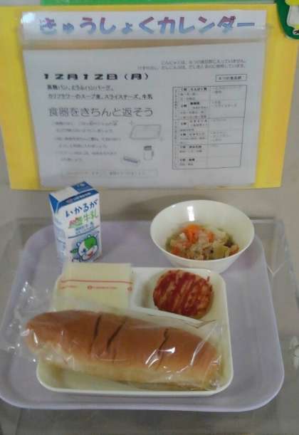 とうふハンバーグ カリフラワーのスープ煮 スライスチーズ 黒糖パン 牛乳 ケチャップ
