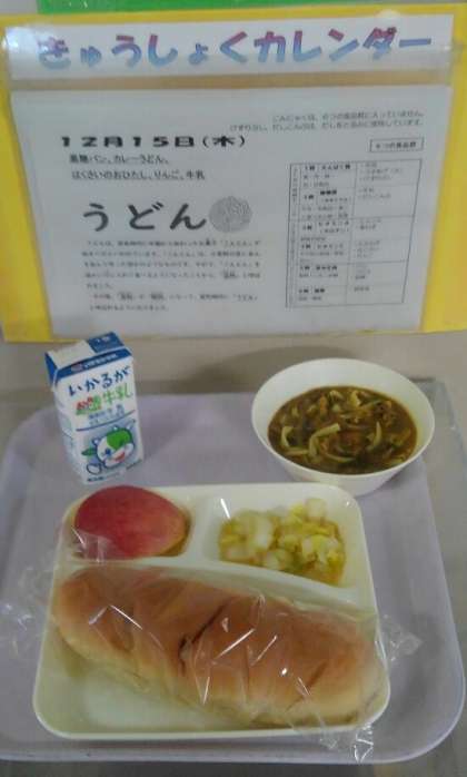 カレーうどん はくさいのおひたし りんご 黒糖パン 牛乳