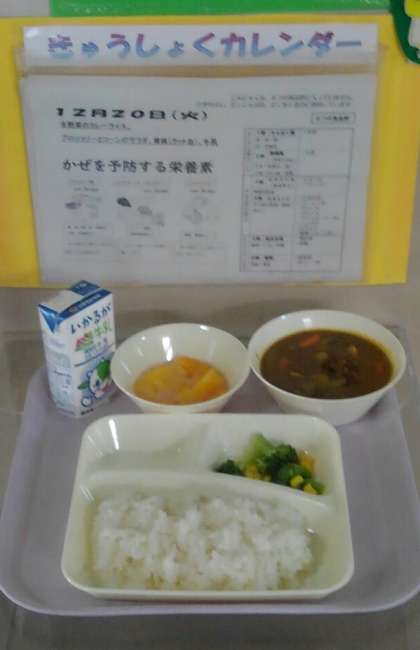 冬野菜のカレーライス ブロッコリーとコーンのサラダ 黄桃(カット缶) ごはん 牛乳