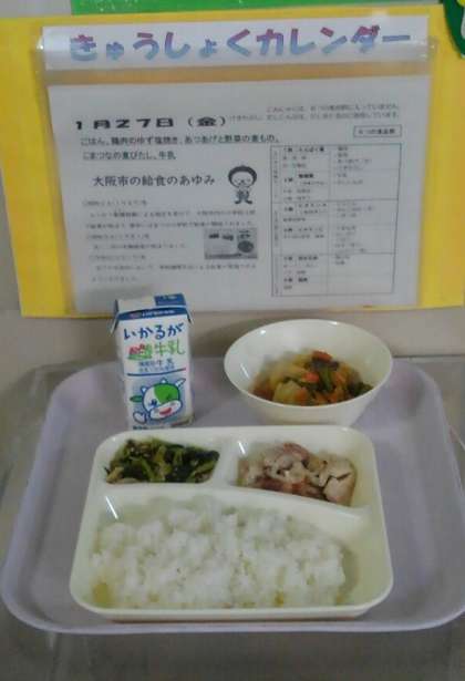 来週30日(月)は、新東三国小学校が代休のため、給食がありません。1・2年生のみなさんは、昼食の用意を忘れないようにしてください。