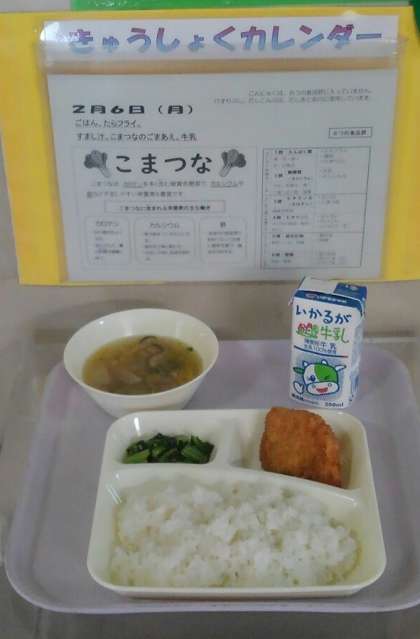 たらフライ すまし汁 こまつなのごまあえ ごはん 牛乳