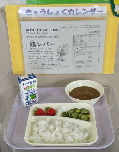 チキンレバーカレーライス きゅうりとコーンのサラダ いちご ごはん 牛乳