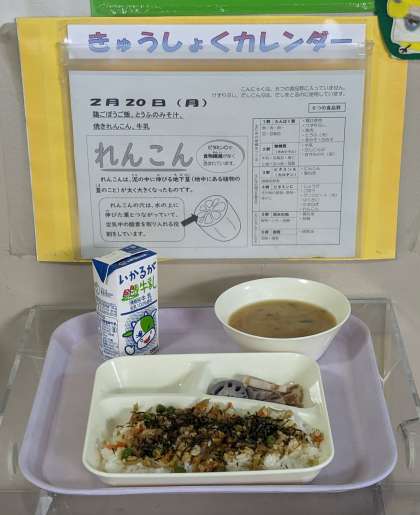鶏ごぼうご飯 とうふのみそ汁 焼きれんこん ごはん 牛乳