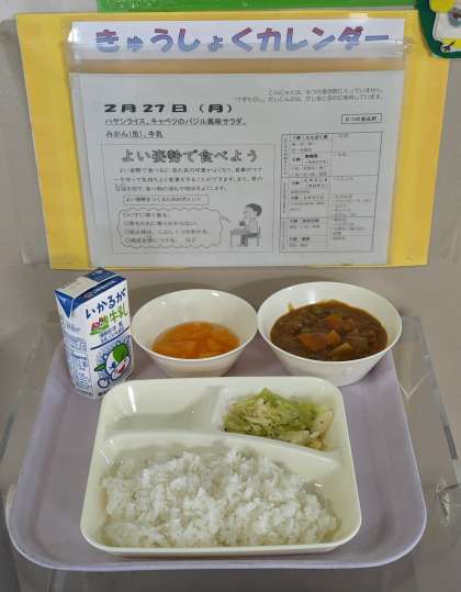 ハヤシライス キャベツのバジル風味サラダ みかん(缶) ごはん 牛乳