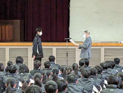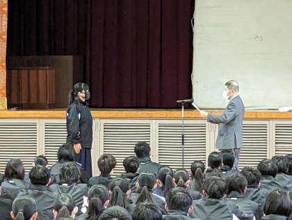 以前の全校集会での表彰の様子です。紹介するのが遅くなりすみません。