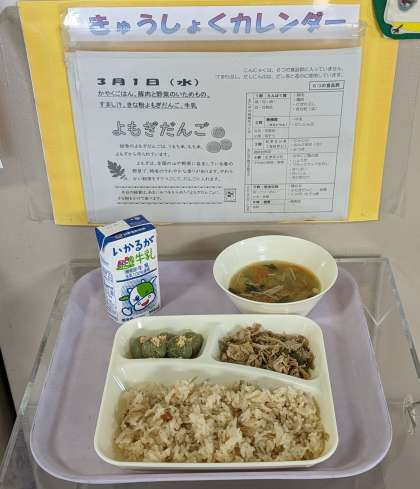 豚肉と野菜のいためもの すまし汁 きな粉よもぎだんご かやくご飯 牛乳