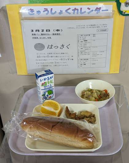 鶏肉のカレー風味焼き 洋風煮 はっさく 黒糖パン 牛乳