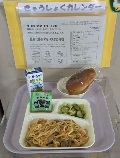さけのクリームスパゲッティ キャベツときゅうりのサラダ ソフト黒豆 黒糖パン(1/2) 牛乳
