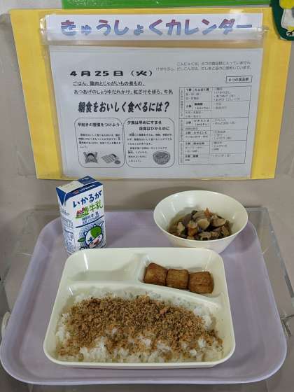 鶏肉とじゃがいもの煮もの あつあげのしょうゆだれかけ 紅ざけそぼろ ごはん 牛乳