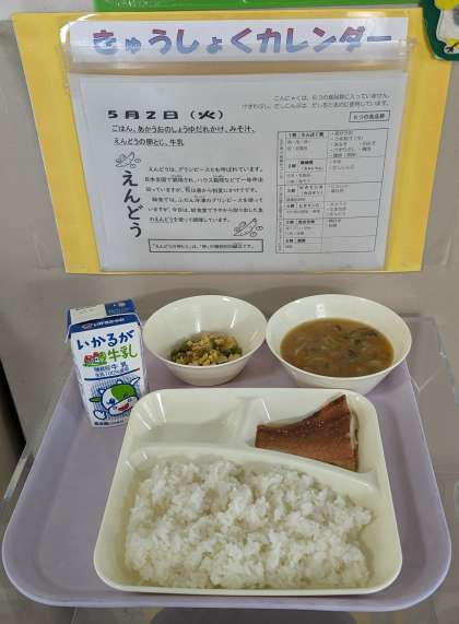 あかうおのしょうゆだれがけ みそ汁 えんどうの卵とじ ごはん 牛乳
