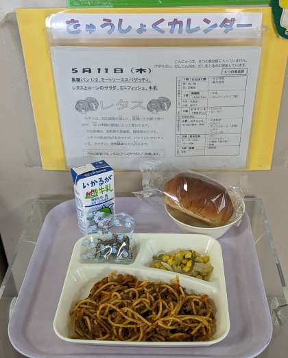 ミートソーススパゲッティ レタスとコーンのサラダ ミニフィッシュ 黒糖パン(1/2) 牛乳