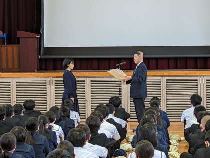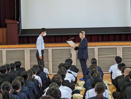 昨日の全校集会では表彰もありました。一つは以前に紹介した女子バレーボール部、大阪市春季総体二次予選1ブロックA地区第3位、もう一つは市長杯第16回大阪市陸上競技フェスタ、中学生男子の部110メートルハードル第2位という結果です。それぞれ日頃の努力が表れた結果だと思いますが、さらに今後につなげていけるように頑張ってください。