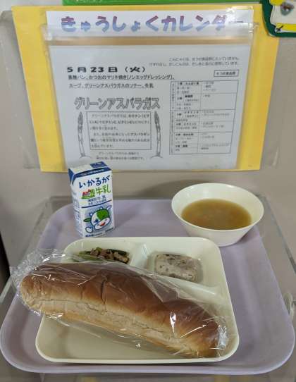 グリーンアスパラガスのソテー 黒糖パン 牛乳