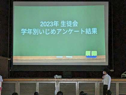 また生徒会役員より、先日行った「いじめアンケート」の結果についての報告がありました。件数は少ないものの、残念ながら各学年で嫌な思いをしている人を見かけたという人がいました。