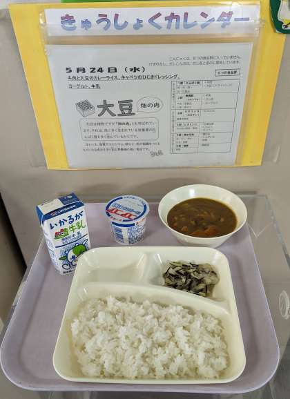 牛肉と大豆のカレーライス キャベツのひじきドレッシング ヨーグルト ごはん 牛乳