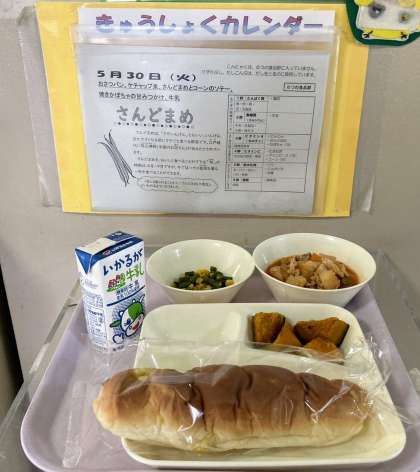 ケチャップ煮 さんどまめとコーンのソテー 焼きかぼちゃの甘みつかけ おさつパン 牛乳