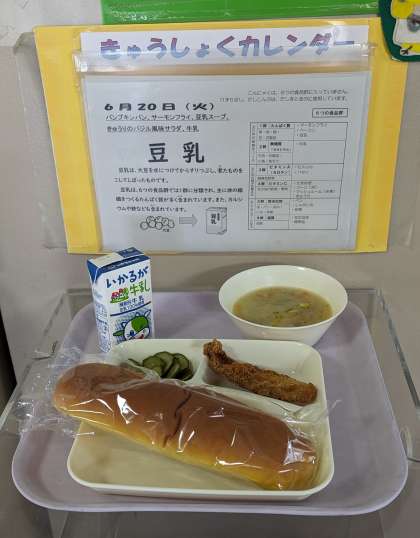 サーモンフライ 豆乳スープ きゅうりのバジル風味サラダ