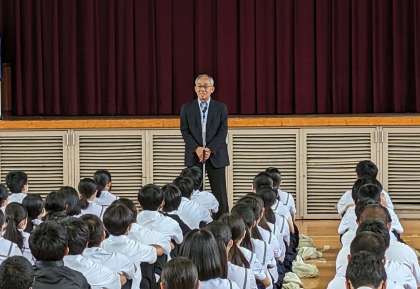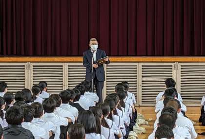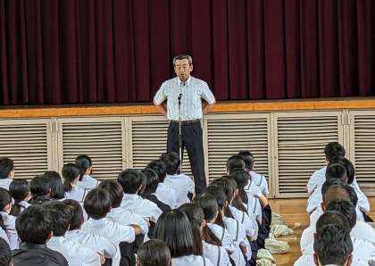 昨日のテスト終了後、体育館に集合し、ジュニアリーダー結成式を行いました。東三国地域活動協議会会長の板谷さん、新東三国地域活動協議会会長の仲川さんも来られ、お話をしていただきました。これまで行ってきた標語やポスター作り、うちわのデザイン、地域清掃など、地域に関わる取り組みも行っていきますが、今後地域の行事等についてもお知らせします。ボランティア活動に興味のある人はぜひ参加してくださいね!