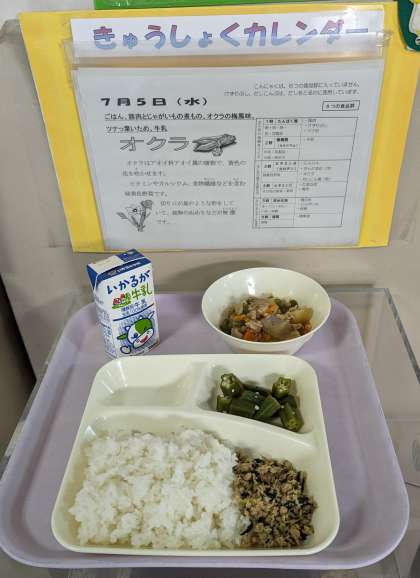 豚肉とじゃがいもの煮物 オクラの梅風味 ツナっ葉いため ごはん