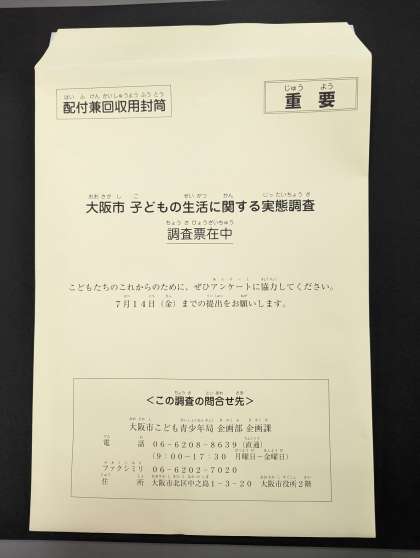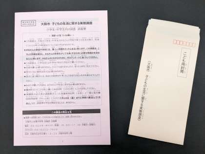 大阪市では「こどもの貧困対策推進計画」を策定し、取組を進めています。今回、令和7年度以降の計画の策定に向けて、大阪府と共同で中学2年生と小学5年生およびその保護者の方にアンケートのご協力をお願いすることになりました。