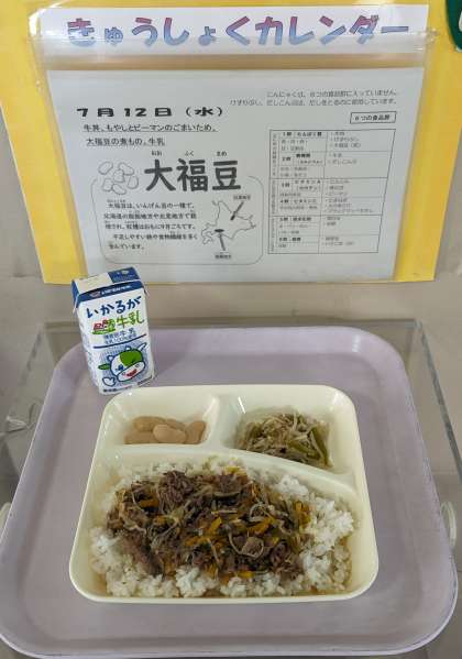 牛丼 もやしとピーマンのごまいため 大福豆の煮もの ごはん 牛乳