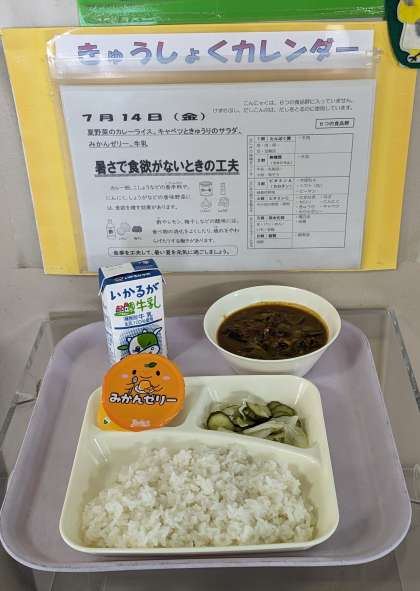 夏野菜のカレーライス キャベツときゅうりのサラダ みかんゼリー