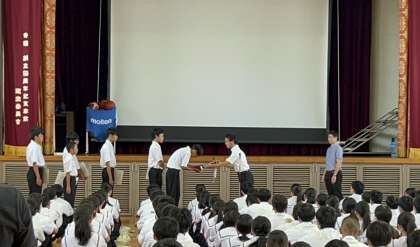 今日はテニス部男子の表彰を行いました。この夏休みに以下のようなすばらしい結果を収めています。これを励みに今後さらに頑張ってくれることを期待しています。