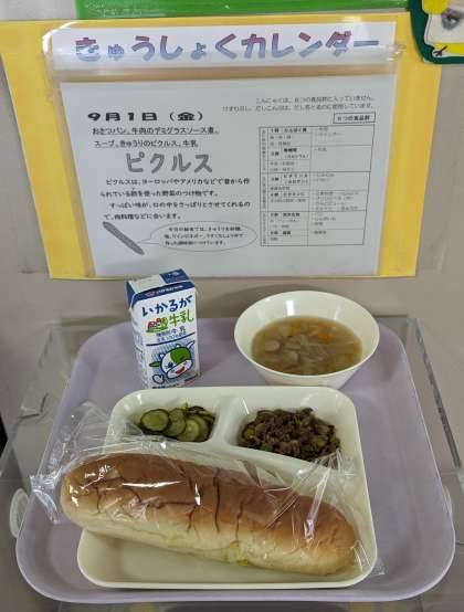 牛肉のデミグラスソース煮 スープ きゅうりのピクルス おさつパン 牛乳