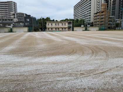 今日は朝から業者の方にお願いして、グラウンドのにがりまきをしていただきました。これで土や砂が湿気を帯びてグラウンドの表面が安定し、砂ぼこりが舞いにくくなるそうです。
