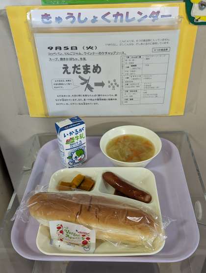 ウインナーのケチャップソース スープ 焼きかぼちゃ 大型コッペパン 牛乳 りんごジャム