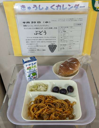 イタリアンスパゲッティ キャベツのバジル風味サラダ ぶどう(巨峰) 黒糖パン(1/2) 牛乳