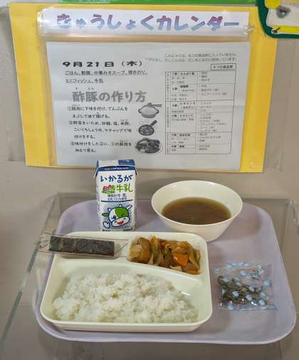 酢豚 中華みそスープ 焼きのり ミニフィッシュ ごはん 牛乳