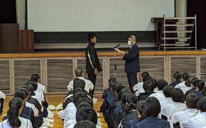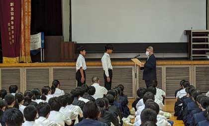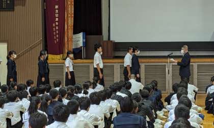 また、新しい生徒会役員および後期の学級役員の認証式もありました。学級役員は各学年2組の女子学級代表がすべての委員の代表として校長先生より認証状を受け取りました。生徒会役員をはじめ、各委員の人は、これから責任をもってそれぞれの役割を果たしてほしいと思います。そして委員以外の人も、委員に全部任せてしまうのではなく、いっしょに協力して取り組む気持ちを忘れないでくださいね。