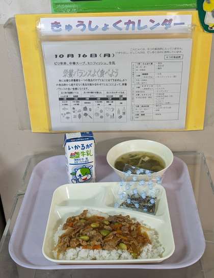 ピリ辛丼 中華スープ ミニフィッシュ ごはん 牛乳