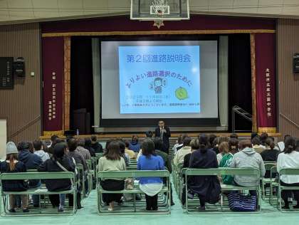 3年生は来週14日(火)から進路懇談会が始まります。その前に、今日の説明会の内容や資料を参考に、ご家庭でしっかり相談していただけたらと思います。なお、本日説明会に参加されなかった3年生の保護者の方には、明日お子さまを通じて資料をお渡ししますので、ご確認お願いいたします。