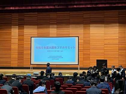 本日13時より、城東区民センターにおいて大阪市スマホサミットが開かれました。本校からも生徒会役員2名が参加し、各ブロック代表校からの報告の後、スマートフォン等の適切な使用について協議しました。今回の内容については、後日全校集会等で報告の予定です。