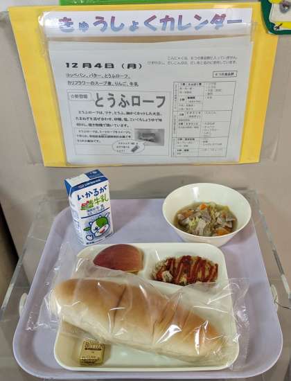 とうふローフ カリフラワーのスープ煮 りんご 大型コッペパン 牛乳 バター