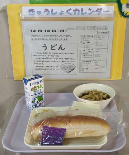 カレーうどん はくさいのおひたし スライスチーズ 大型コッペパン 牛乳 ブルーベリージャム