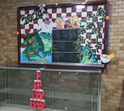 今日の午後、美術部の生徒が新年の飾りつけをしてくれました。校舎に入ってすぐの右手の掲示板です。生徒のみなさんは登校したらぜひ実物を見てくださいね!またちょっと意外なところにも飾りつけがされています。探してみましょう。