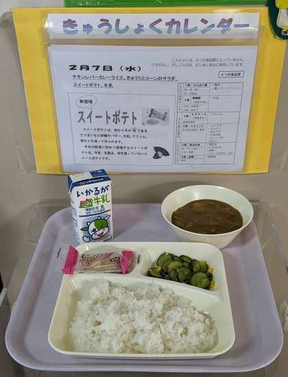 チキンレバーカレーライス きゅうりとコーンのサラダ スイートポテト ごはん 牛乳