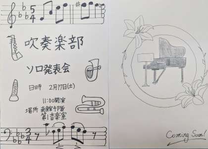 明日17日(土)午前11時より、本校南館4階の第1音楽室にて、吹奏楽部のソロ発表会を行います。日頃の練習の成果を聴きにぜひお越しください。