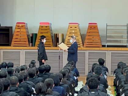 全校集会の際の表彰の様子です。地域のソフトボールチームに所属し、第23回全日本中学生男子ソフトボール大会において準優勝という優秀な成績を収め、教育長表彰の対象となりました。日頃の努力が結果につながることはすばらしいですね。おめでとうございます。