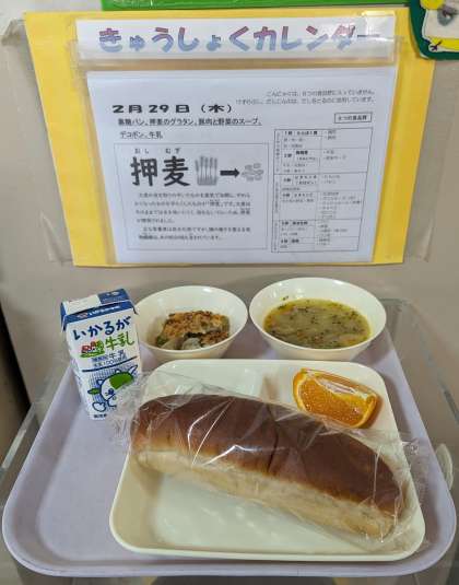 押麦のグラタン 豚肉と野菜のスープ デコポン 黒糖パン 牛乳