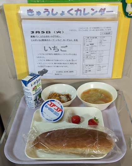 とうふのミートグラタン じゃがいもと野菜のスープ いちご