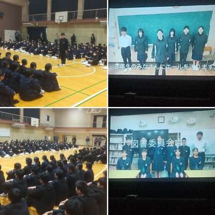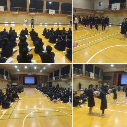 本日の6限目、3年生を送る会が行われました。3年生に向けて、残念ながら卒業式に参列できない1年生からのコサージュの贈呈、代表生徒からのあいさつ、各委員会からの動画メッセージ等があり、3年生からは1・2年生に向けての代表生徒のあいさつや心のこもった合唱がありました。来週の卒業式では、今日よりもさらにすばらしい歌声を響かせてくれることと思います。